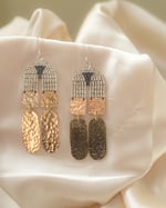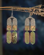 Hammered brass dangles, in a high polish, attached to a sparkly beadwoven arch. Perfect light catchers, with a beautiful movement and a little bit of soft sound. Accompanied by sterling silver ear wires. Completely hand made in my home studio in St. Albert, Canada